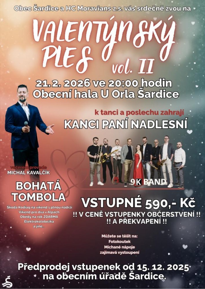 Začátek plesu ve 20.00 hodin, hraje kapela Kanci paní nadlesní, celým večerem provází Michal Kavalčík, který se postará nejen o skvělou zábavu, ale také o disco show. Těšit se můžete na bohatou tombolu a skvělý doprovodný program - lollipop show a vystoupení burlesky.