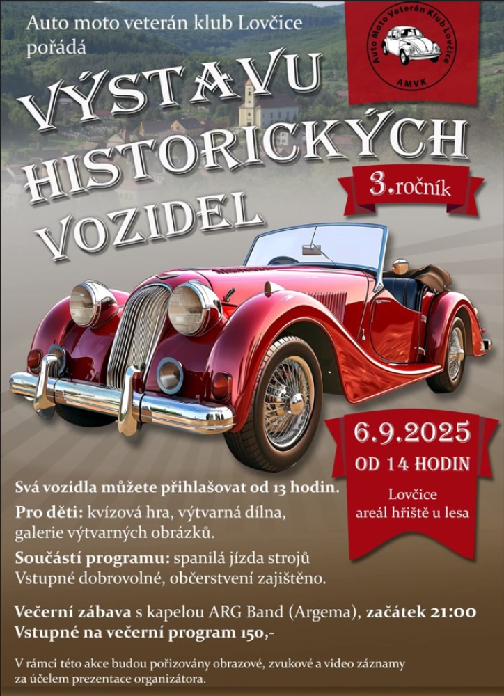 Zveme vás na Výstavu historických vozidel, 6. 9. 2025 od 14:00 hodin Lovčice areál malého hřiště u lesa.